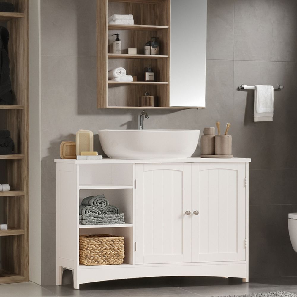 Hoge kwaliteit: Hoogwaardige MDF-panelen, glad oppervlak, zorgvuldige afwerking – perfect voor wie kwaliteit waardeert! Fraaie uitstraling: De duifgrijze kleur, groeven in de kastdeuren en verchroomde metalen handgrepen geven deze kast een unieke uitstraling. Ruime opbergruimte: Aan de linkerkant bevindt zich een open plank met twee verstelbare planken (elk 3 niveaus). Veelgebruikte spullen zoals kammen en parfum zijn hier binnen handbereik opgeborgen. Meer opbergruimte beschikbaar: Kijk naar rechts! Een klein kastje met twee deuren en een verstelbare plank met 3 niveaus biedt ruimte voor handdoeken en toiletpapier. Eenvoudige montage: Gemakkelijk te begrijpen instructies met afbeeldingen en duidelijk gelabelde onderdelen zijn inbegrepen om het monteren van deze badkamerkast moeiteloos te maken.