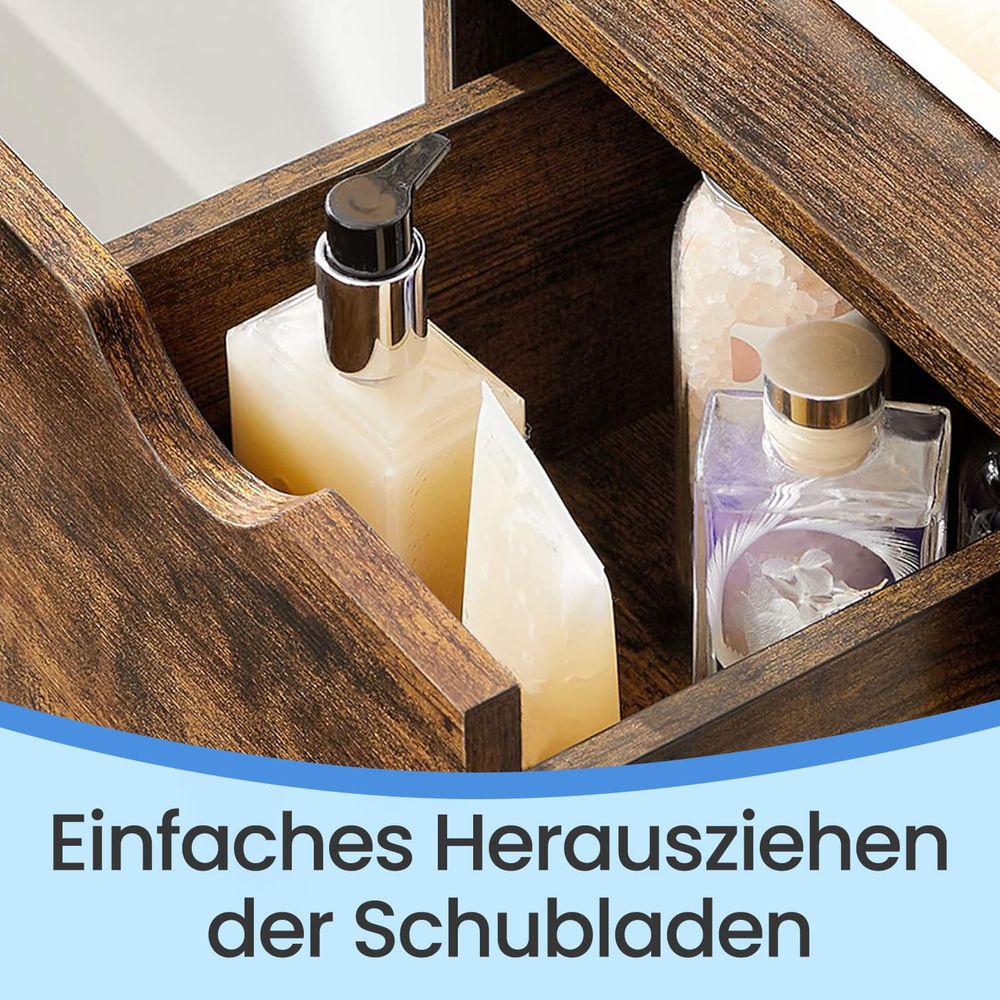 Efficiënte opbergruimte: Tafelblad voor veelgebruikte spullen, 3 lades voor kleine spullen en 3 in hoogte verstelbare planken achter de deur voor verschillende afmetingen - voor een opgeruimde badkamer.