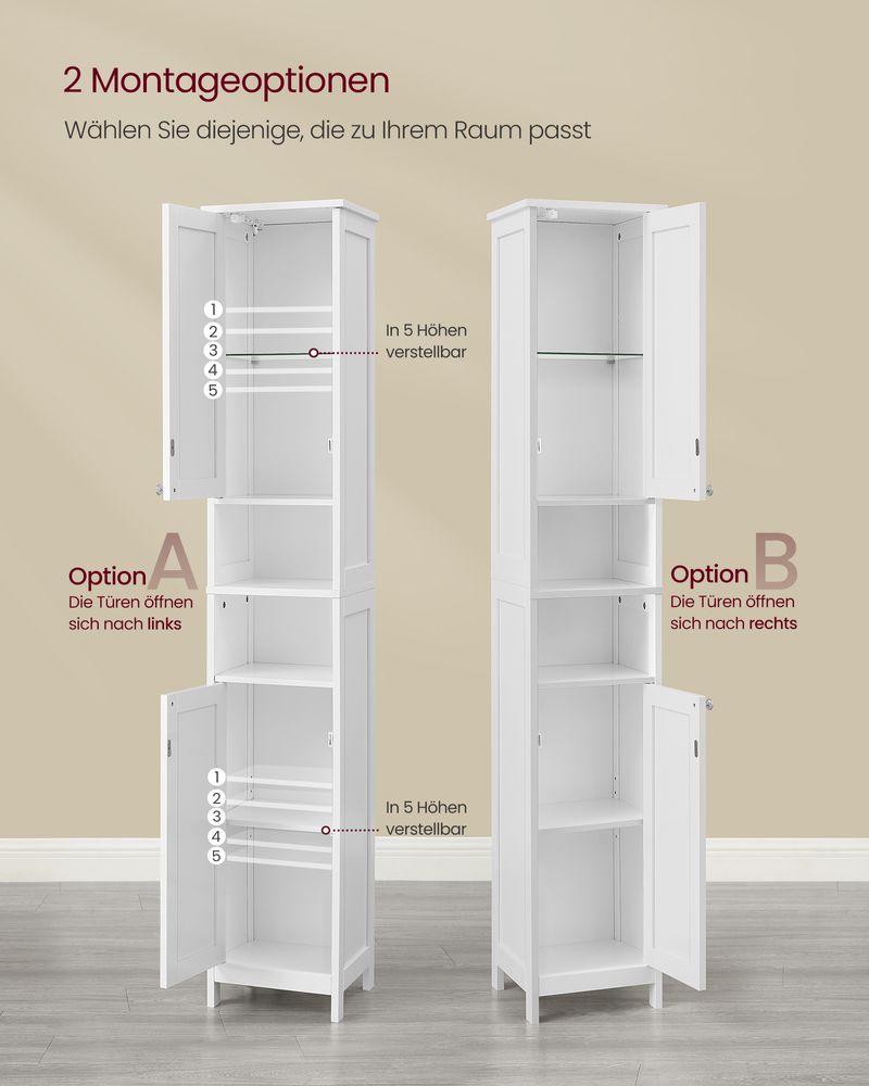 [2 Montagemogelijkheden] De deuren van dit badkamerkastje kunnen naar links of rechts worden geopend, zodat het in elke kamer past en optimaal comfort biedt, ongeacht hoe u de deuren monteert.