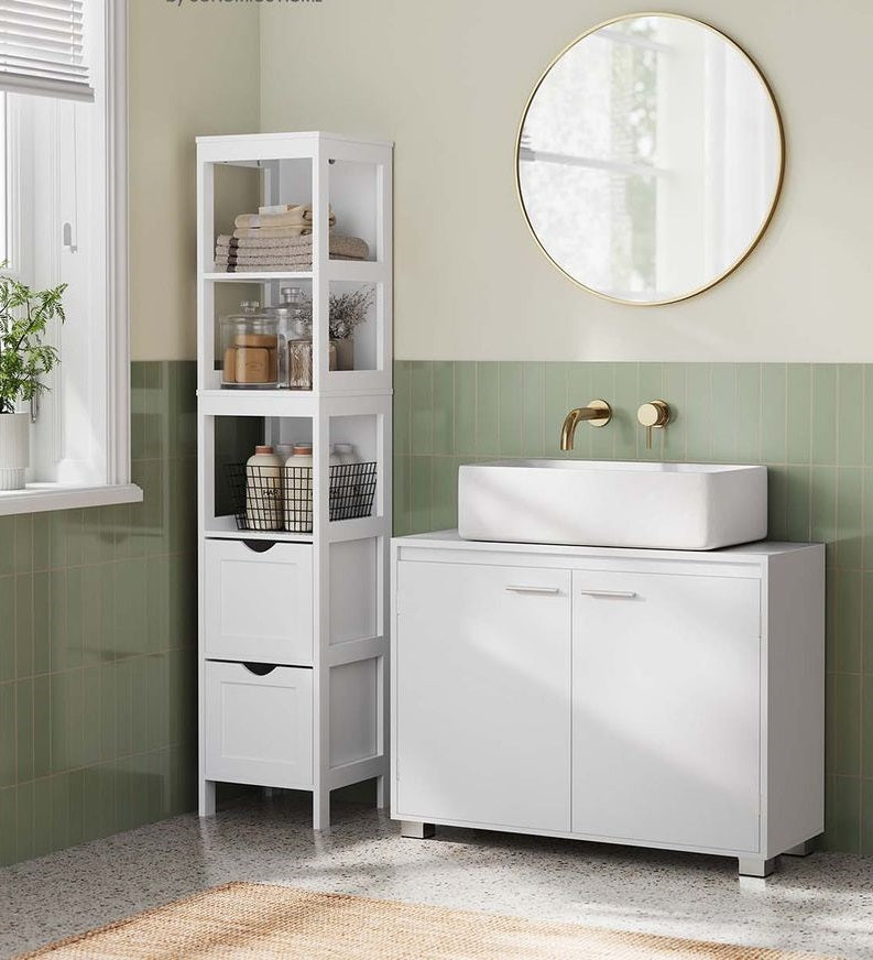 Geschikt voor wastafels met voetstuk: Deze badkamerkast is alleen geschikt voor wastafels met voetstuk. Controleer de afmetingen van de kast en de sifonuitsparing om de compatibiliteit te garanderen.