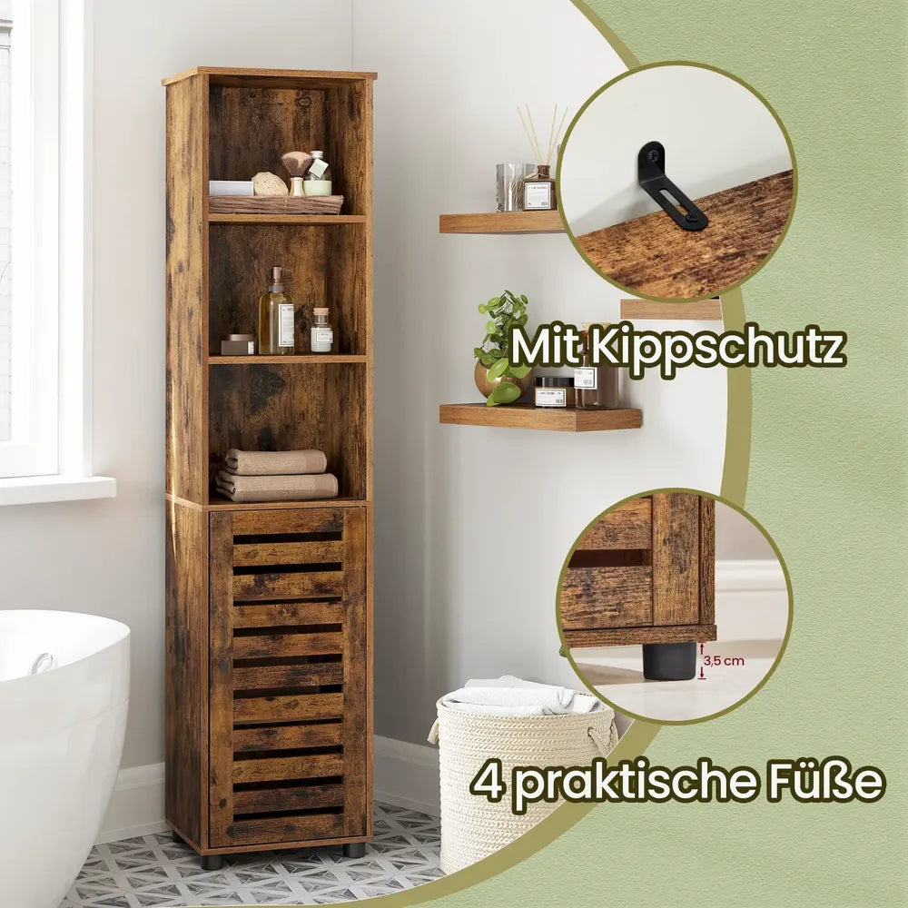 Robuust en veilig: Dit badkamerkastje, gemaakt van hoogwaardig spaanplaat met waterdichte poten, is gebouwd om lang mee te gaan. De kantelbeveiliging verhoogt de stabiliteit en veiligheid in de badkamer.