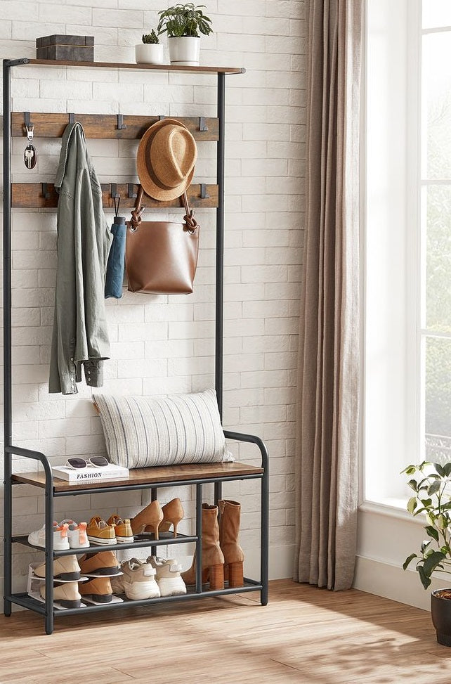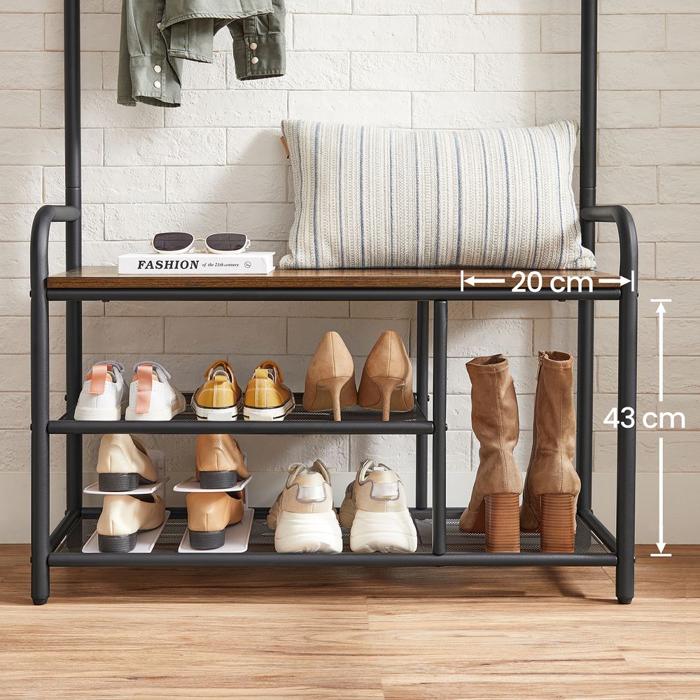 Slim ontworpen: Deze kapstok met een bovenste plank, 9 haken, 2 gaasplanken en een bankje biedt je de mogelijkheid om decoratieve items te presenteren, jassen op te hangen, schoenen op te bergen en te zitten. Perfect!