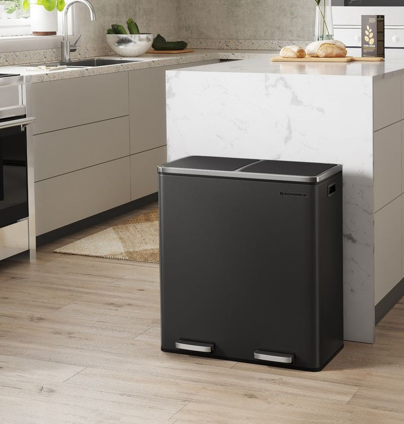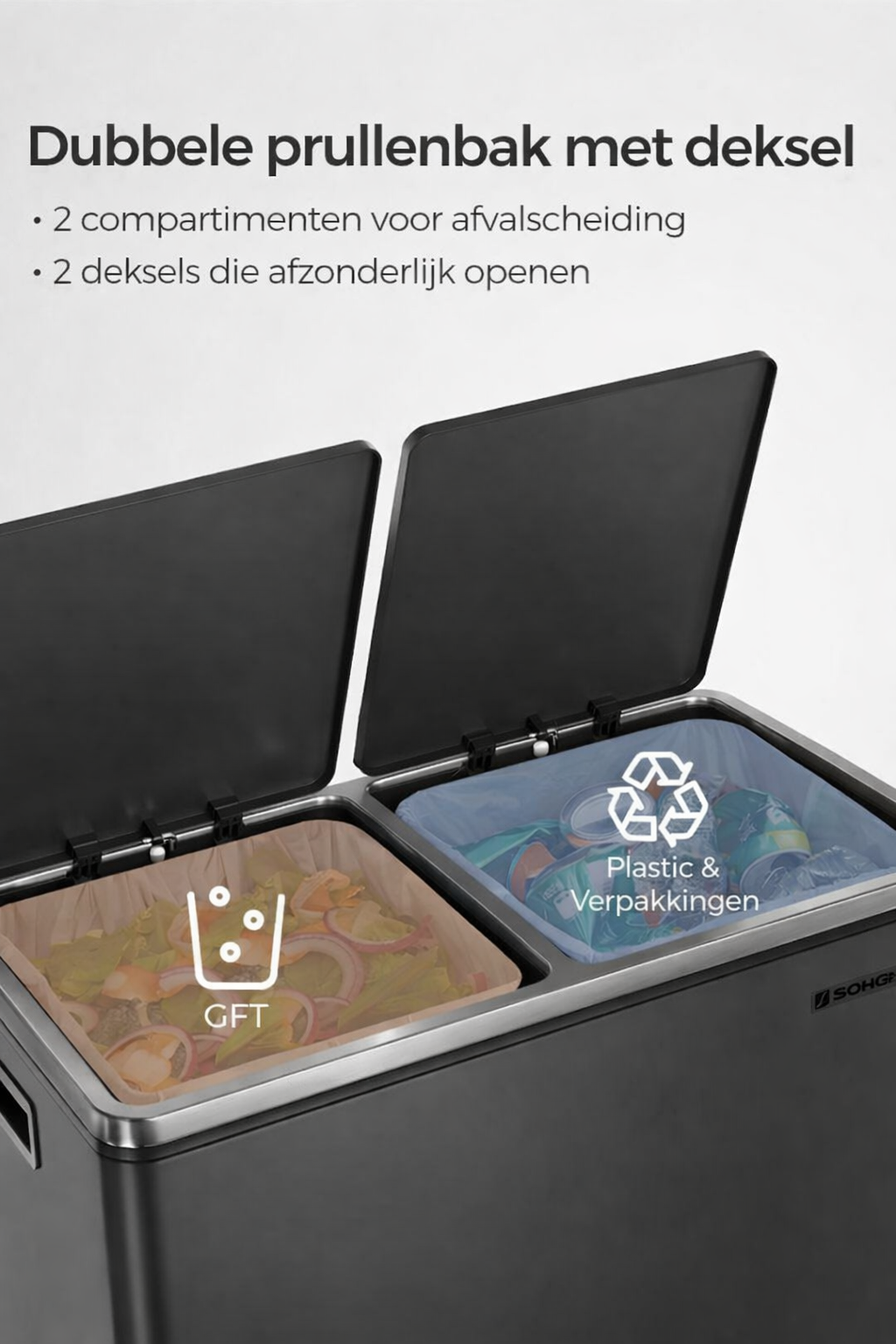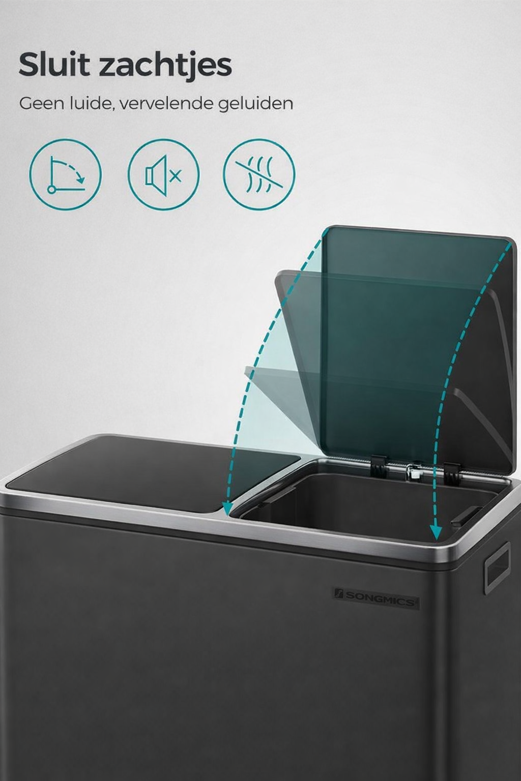 Wat je krijgt: een afvalbak met twee plastic binnenbakken van 30 liter, 15 vuilniszakken en geruisloos sluitende deksels voor eenvoudige afvalverwerking.