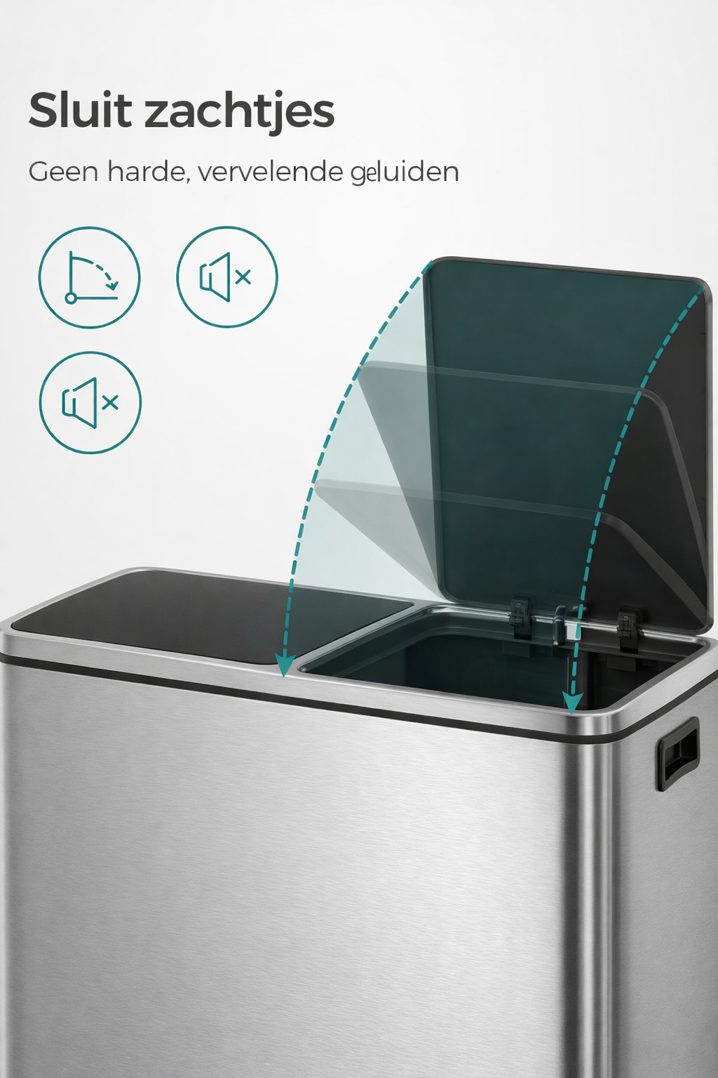 Trap eenvoudig op het voetpedaal en open het deksel, zelfs als u uw handen vol hebt. Leeg vervolgens het afval in het juiste binnenvak. Laat het voetpedaal los en het deksel sluit langzaam en geruisloos, wat zorgt voor een rustige sfeer in huis.