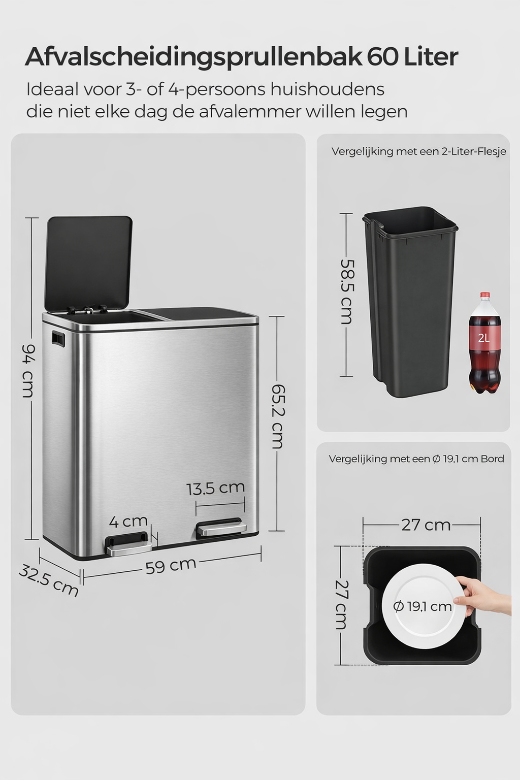 Afmetingen binnenbak: 27 x 27 x 58,5 cm (L x B x H)