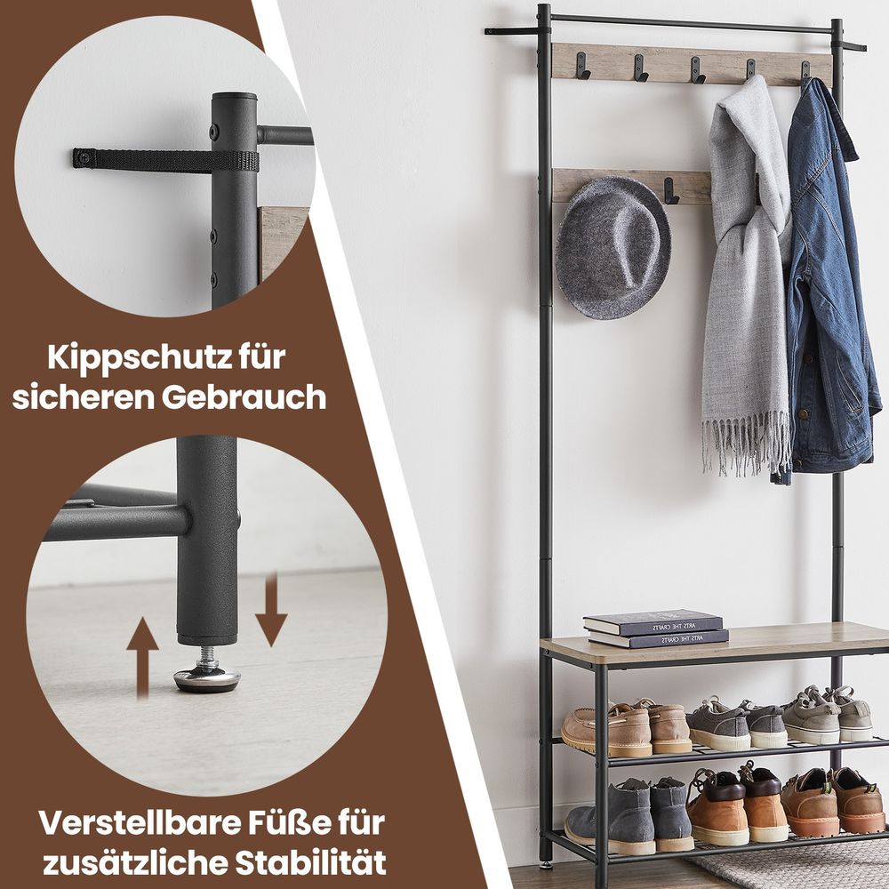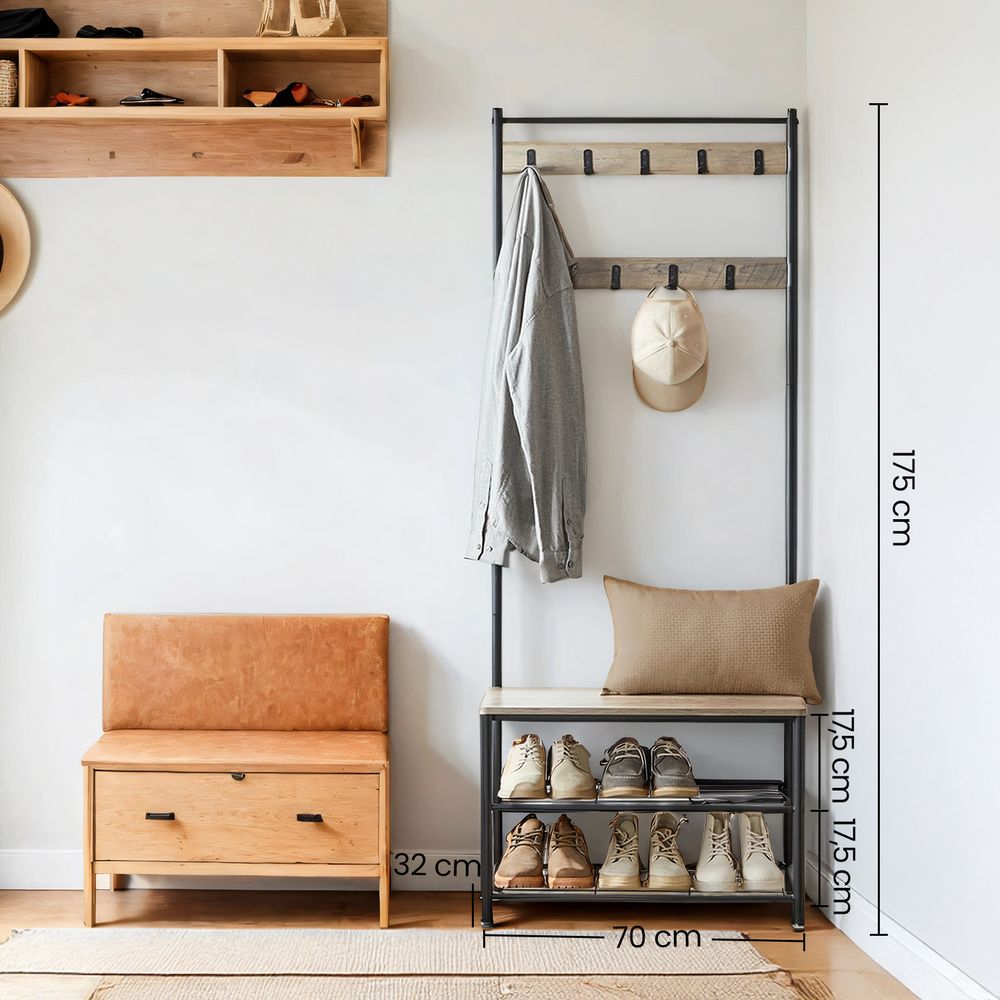 Multifunctionele garderobekast: Dit meubel combineert haken, een bank en een schoenenrek voor een oplossing op het gebied van opbergen en zitten.