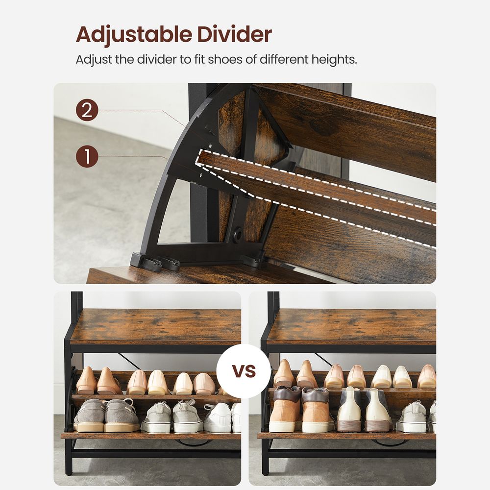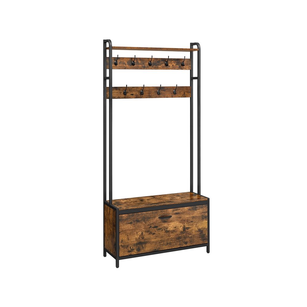 dankzij de constructie van staal en spaanplaat en de V-vormige beugels aan de achterkant is deze garderobekast robuust en stabiel (de bank kan tot 100 kg dragen). Ga gewoon op de bank zitten om uw schoenen comfortabel aan te trekken. Industrieel design – voor een unieke sfeer: De combinatie van vintage bruine spaanplaat en een zwart stalen frame geeft dit kledingrek een industriële touch en je hal een bijzonder karakter.