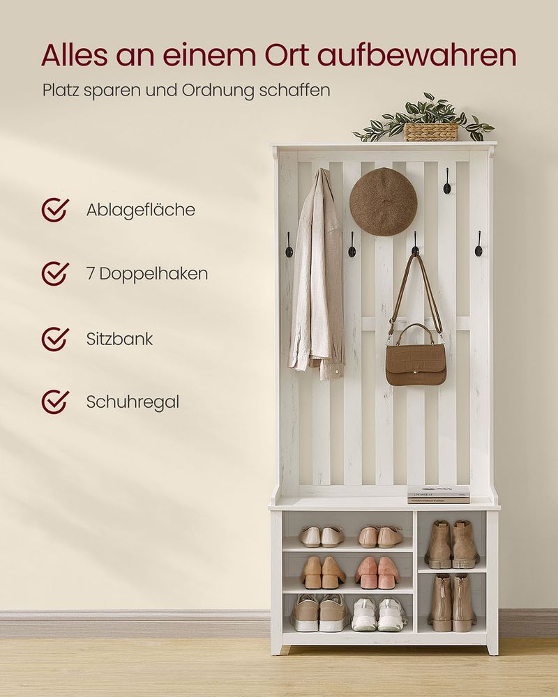 【VEELZIJDIG】1 opbergplank, 7 dubbele haken, 1 schoenenbank en 1 schoenenrek in één! Het kledingrek biedt een plek om te zitten en schoenen te wisselen, en biedt voldoende ruimte om je spullen op te bergen voordat je het huis verlaat.