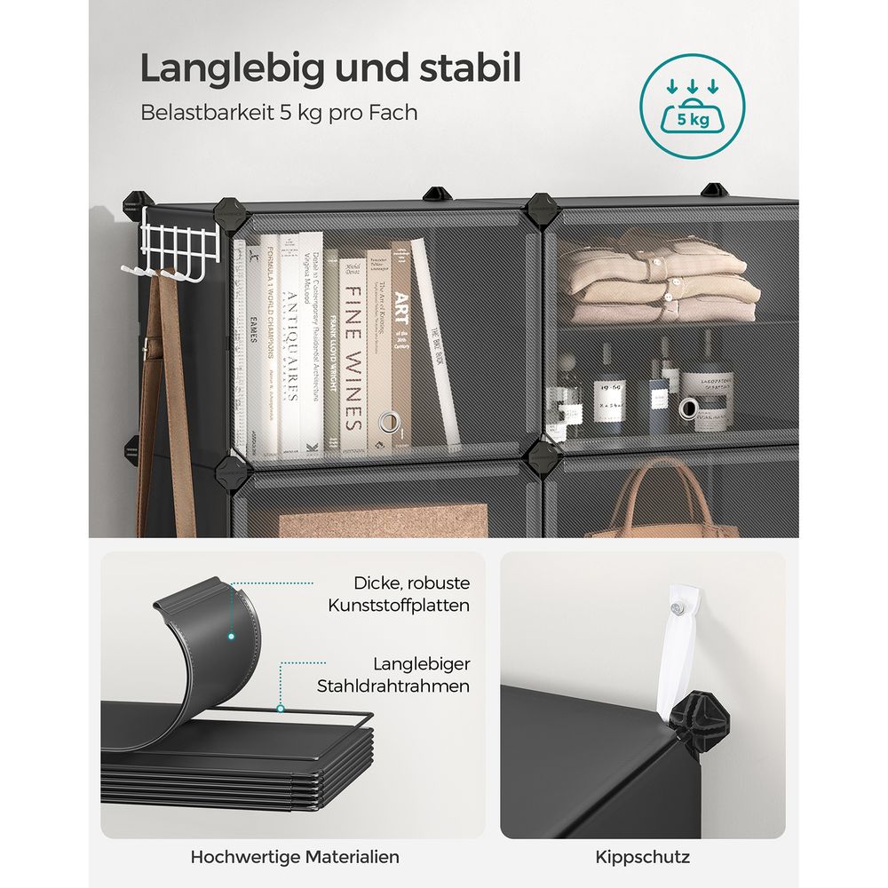 [Eenvoudig te reinigen & goed geventileerd] Het plankensysteem met transparante deuren is stof- en waterdicht en kan eenvoudig worden gereinigd met een vochtige doek; Het oogje in elke deur dient zowel als handgreep als voor ventilatie om onaangename geuren te voorkomen.